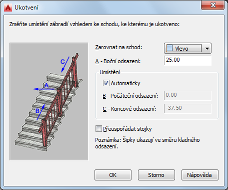 Tento postup slouží ke změně zarovnání zábradlí a bočního, počátečního a koncového odsazení. Tyto vlastnosti se vztahují pouze na zábradlí připojené ke schodišti.