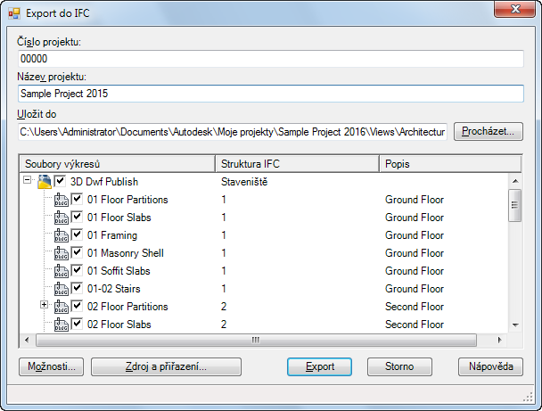 Vy určujete, které externí reference z projektového souboru budou exportovány a jak se budou v souboru IFC zobrazovat, přijetím přiřazení na výchozí úrovni nebo určením jiného popisku. Všechny výkresy, které jsou přiřazeny ke stejné struktuře IFC, jsou exportovány do IfcBuildingStorey v souboru IFC.