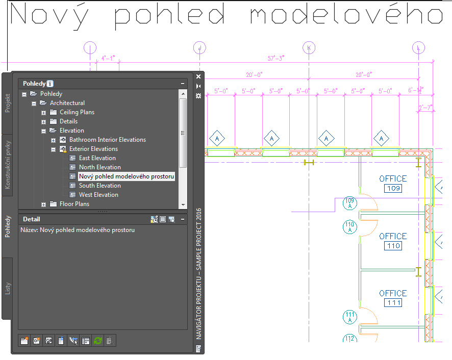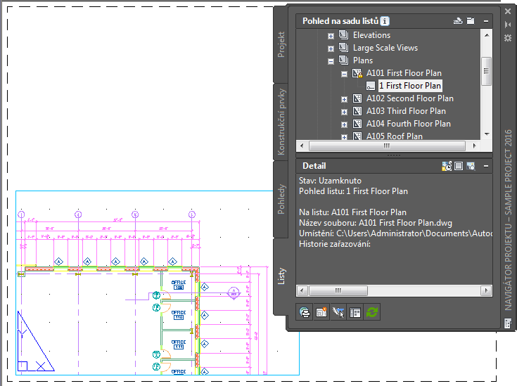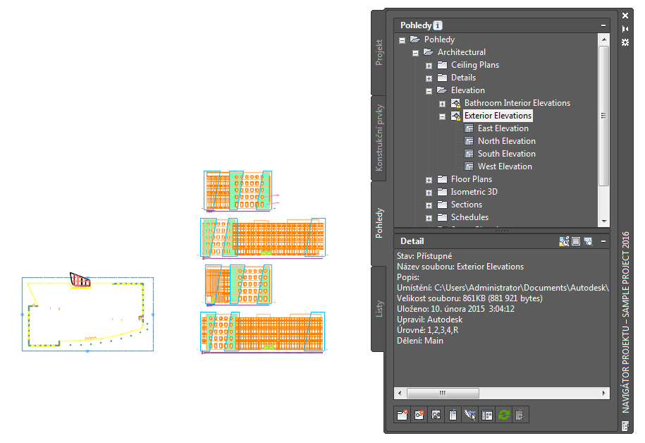 Výkres pohledu se vytváří výběrem konstrukčních prvků na paletě Navigátoru projektu a vytvořením reference na tyto prvky ve výkresu pohledu. Pokud vytváříte pohledy s více hladinami, každý konstrukční prvek je odkazován ve své relativní výšce hladiny, kdy nejnižší hladina je vložena na Z = 0.