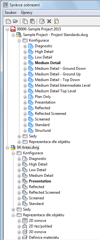 Do projektových výkresů můžete přidat standardní nastavení zobrazení ve Správci zobrazení. Když je standardní zobrazení výkresu zadáno v konfiguraci projektových norem, je zobrazeno ve Správci zobrazení v uzlu projektu. Odtud můžete přetáhnout konfigurace zobrazení, sady zobrazení a reprezentace zobrazení do uzlů projektových výkresů.
