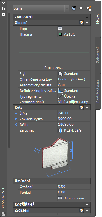 Paleta Vlastnosti představuje centrální místo pro zobrazení a úpravy jak fyzických, tak i grafických vlastností objektu. V případě objektu se může jednat buď o objekt, který se chystáte nakreslit, nebo o objekt, který je již vybrán ve výkresové oblasti. Pomocí karty Rozšířená data na paletě Vlastnosti můžete k objektu také připojit další typy informací, jako jsou klasifikace, poznámky, referenční dokumenty, hypertextové odkazy a data sad vlastností. Obvykle se během relace aplikace AutoCAD Architecture ponechává paleta Vlastnosti otevřená.