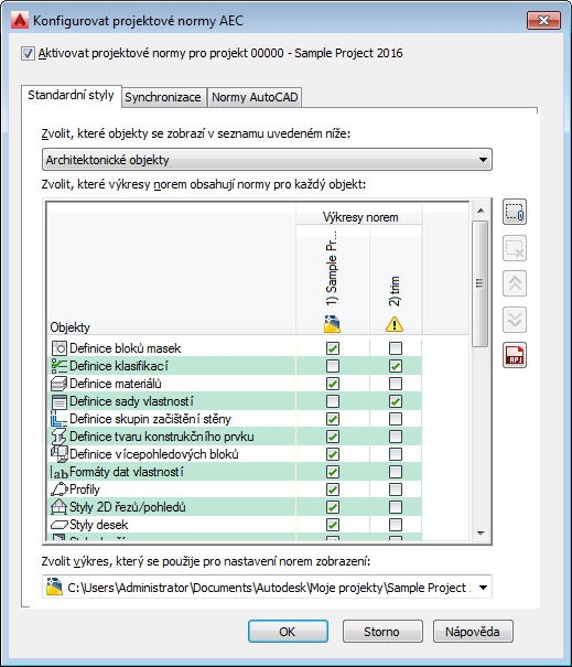Když je projekt nebo projektový výkres synchronizován s jeho normami, jeho styly a nastavení zobrazení jsou porovnány s projektovými normami, aby byly nalezeny nesrovnalosti verzí mezi nimi a jejich následnou opravu.