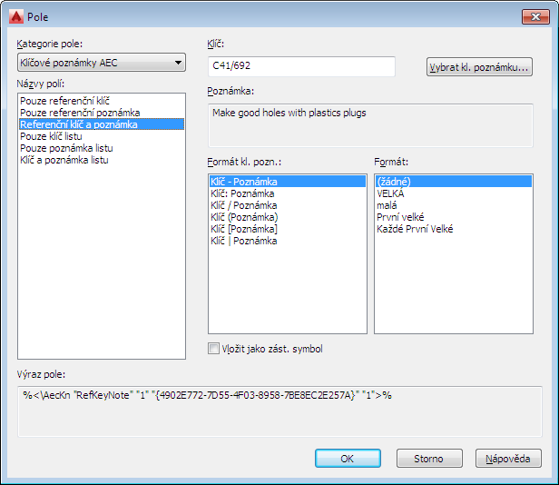| vložit pole klíčové poznámky do prvku textu | viz část Vkládání polí do textu aplikace AutoCAD. |