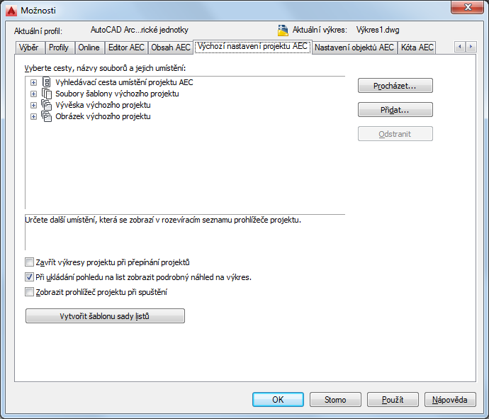 Zadání výchozích možností v části Výchozí hodnoty projektu AEC u aktuálního výkresu