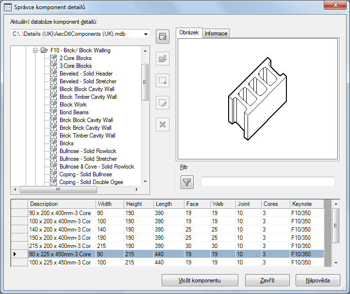 Dialog Správce komponent detailů se zobrazenou tabulkou betonového zdiva