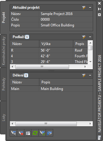 Paleta Navigátor projektu představuje centrální místo, kde je možné vytvářet, měnit a otevírat projektové soubory aplikace AutoCAD Architecture. Při práci na projektu je paleta Navigátor projektu obvykle v pracovním prostoru otevřená.
