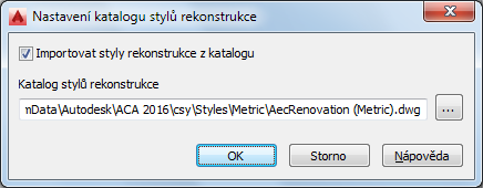 Ve výchozím nastavení je katalog stylů rekonstrukce (AecRenovation.dwg) instalován ve složce ProgramData\Autodesk\ACA <verze>\csy\Styles. Pokud katalog stylů rekonstrukce přejmenujete nebo přesunete, budou styly deaktivovány a nebudou již k dispozici. Pomocí dialogu Nastavení katalogu stylů rekonstrukce určete platný katalog.