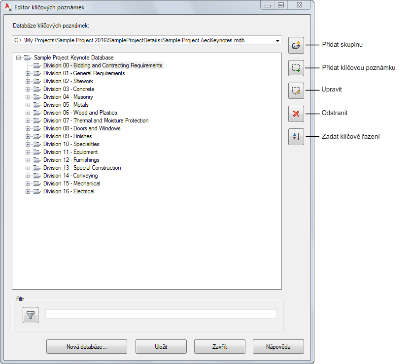 Editor klíčových poznámek je samostatná aplikace, která umožňuje vytvořit a změnit databáze klíčových poznámek. Je-li dialog Editor klíčových poznámek otevřen z nabídky Správce CAD, umožňuje hierarchické stromové prohlížení aktuálně vybrané databáze, která je zobrazena jako kořenový uzel. Pro existující databáze můžete rozbalit kořenový uzel, aby se zobrazily skupiny, a poté můžete rozšířit uzly skupin, aby se zobrazily podskupiny nebo jednotlivé klíčové poznámky. Případně můžete zadat text do pole Filtr, které se nachází pod stromovým zobrazením. Kliknutím na tlačítko Filtr, stisknutím klávesy Tab nebo stisknutím klávesy Enter rozbalíte všechny uzly pod libovolným uzlem, jehož název zahrnuje zadaný text.