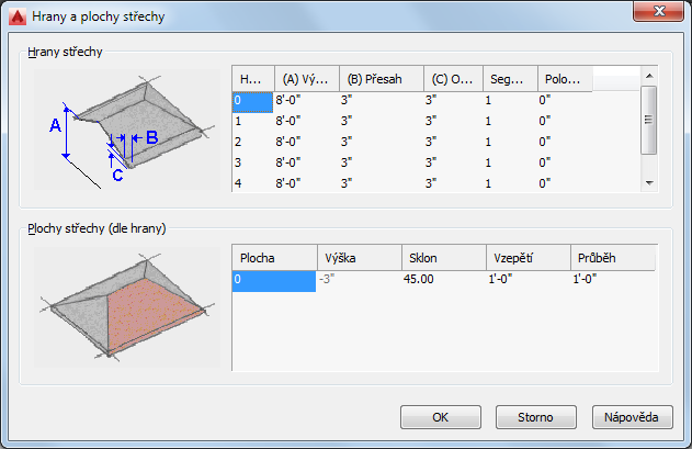 | změnit počet segmentů u zakřivené střechy pro hranu střechy | vyberte položku Segmenty pro hranu střechy a zadejte počet segmentů. |