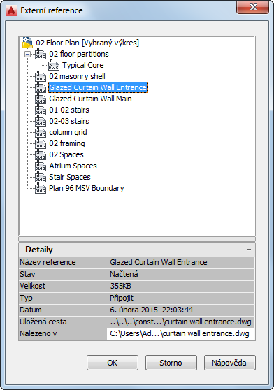 Poznámka: Externí reference můžete zobrazit také otevřením konstrukčního prvku ve výkresové oblasti aplikace AutoCAD Architecture a pomocí Správce externích referencí aplikace AutoCAD.