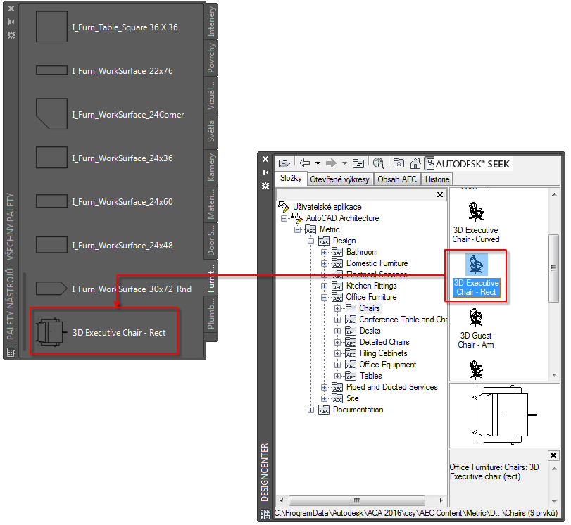 Položky obsahu AEC je možné ze složky DesignCenter přetahovat do palety nástrojů.