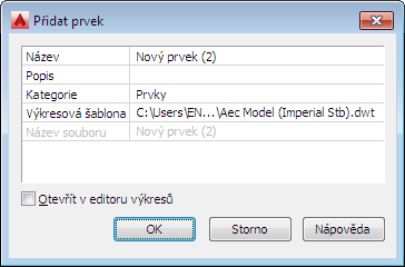 | pojmenovat nový prvek | zadejte název. Pokud se číslo projektu použije jako předpona názvů souborů projektu, není nutné zde předponu zadávat. Úplný název s předponou se zobrazuje pod možností Název souboru. |