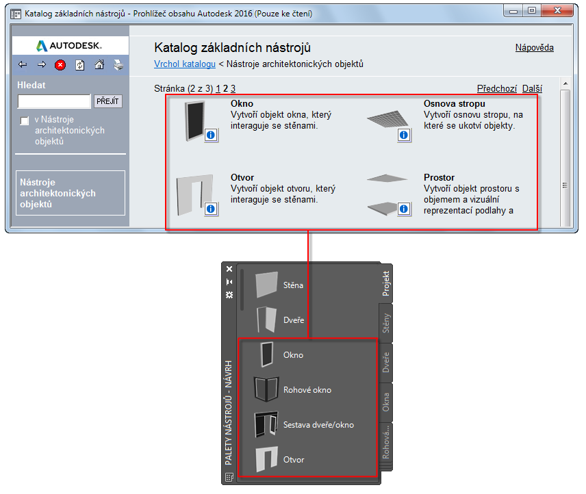 Tento postup se používá k připojení nástroje z katalogu v Prohlížeči obsahu do palety nástrojů v aplikaci AutoCAD Architecture.