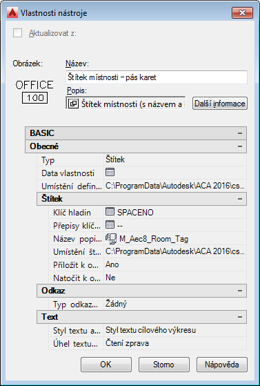 Poznámka: Pokud zvolíte možnost Obnovit z, všechny vlastnosti nástroje v tabulce se nastaví pouze pro čtení. Vlastnosti pro tento nástroj se musí změnit v Prohlížeči obsahu.