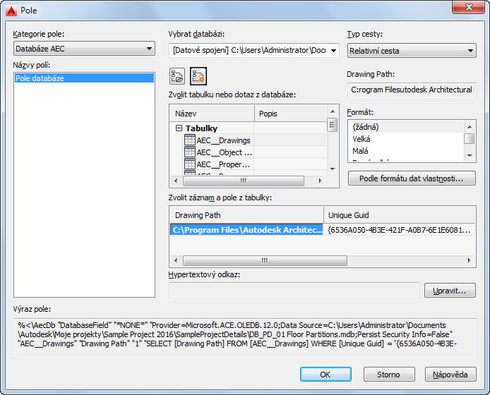 Tento postup slouží k výběru pole databáze k vložení do výkresu.