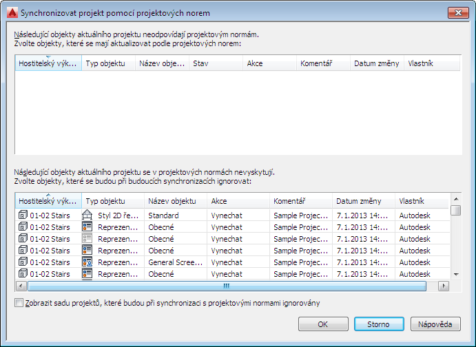 V dialogu synchronizace se zobrazují dva seznamy. Horní seznam obsahuje styly a nastavení zobrazení, která jsou buď staršími verzemi stylů norem nebo nastavení zobrazení, nebo nestandardními (novějšími) verzemi. Spodní seznam obsahuje soupis nejednotných stylů a nastavení zobrazení. Definice termínů najdete v tématu O terminologii projektových norem.