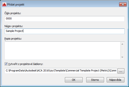Poznámka: Přímo při vytváření nového projektu nelze zadat všechny podpůrné soubory a cesty. Definovat lze pouze název, číslo, popis a šablonu projektu. Zbývající nastavení lze definovat až po vytvoření projektu. Pokud projekt vytváříte na základě šablony, bude nastavení šablony použito pro počáteční nastavení.