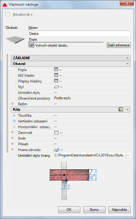 Poznámka: Styly hran desek nelze aplikovat jako součást definice stylu desky; místo toho je lze aplikovat jako vlastnost paletového nástroje. Řada stylů desek, které jsou obsaženy ve vzorových souborech obsahu dodávaných s aplikací AutoCAD Architecture, ve svých názvech indikují specifický styl hrany desky, a pokud se z těchto stylů vytvoří nástroj, styl desky je již přiřazen k vlastnostem nástroje. Tyto styly vznikly v dřívější verzi softwaru, kde bylo možné přiřazovat výchozí styly hran desek ke stylu desky. Tato možnost byla z uživatelského rozhraní editoru stylů desek odstraněna, vlastnosti stylu však byly v těchto vzorových stylech ponechány.