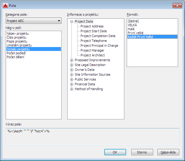 Pokud například chcete zobrazit detaily projektu, vyberte položku Projekt AEC pro kategorii Pole a poté Detaily projektu pro Název pole.