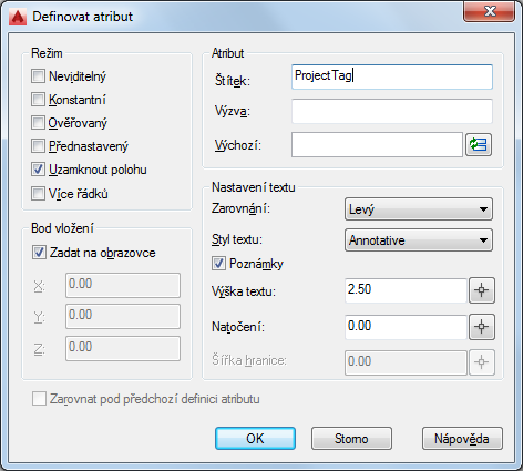 Tento postup slouží k přidání atributů projektu pro blok nadpisů do výkresu.