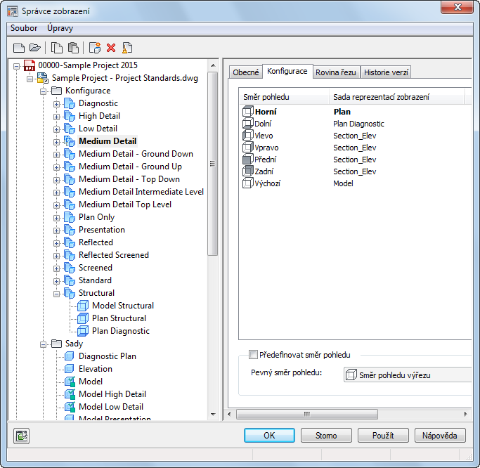 Ikony které se používají se sadami zobrazení a směry pohledu označují jak je sada zobrazení používaná v konfiguraci. Jestliže rozbalíte konfiguraci zobrazení sady zobrazení, které se v ní používají jsou zobrazeny. Ikona vedle každé sady zobrazení označuje směr pohledu ve kterém je použita v konfiguraci zobrazení.