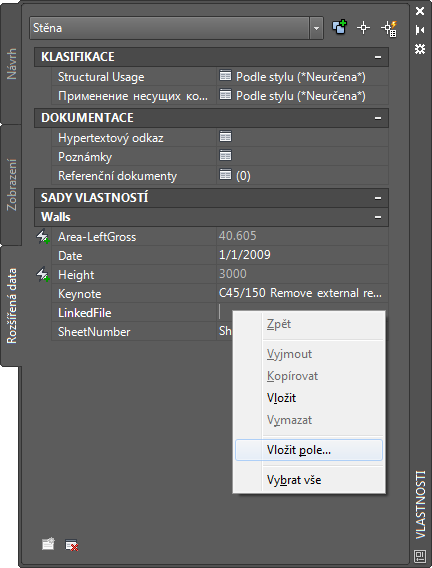 | vložit datum/čas, dokument, odkaz, objekt, systémová proměnná, výraz DIESEL nebo pole vykreslování | viz téma Použití polí v textu v Nápovědě k aplikaci AutoCAD. |