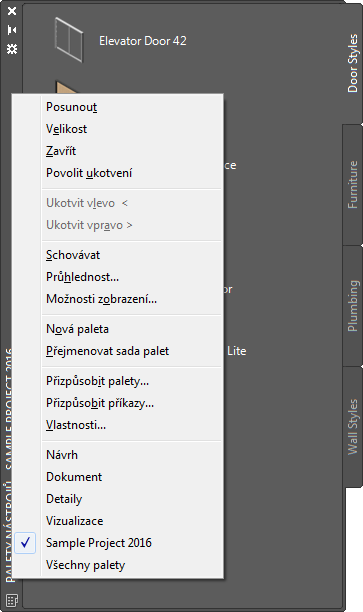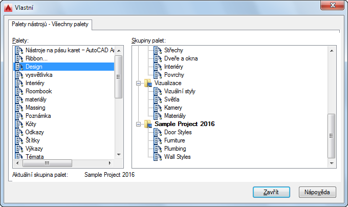 . - Jestliže skupina palet nástrojů projektu obsahuje nejméně jednu paletu, zobrazí se na seznamu dostupných skupin palet nástrojů a může být vybrána.