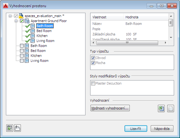 - Vyberte prostory a zóny, které chcete zahrnout do vyhodnocení půdorysu zaškrtnutím příslušných políček.