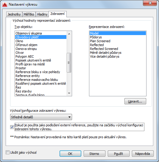 Zadání výchozích možností zobrazení u aktuálního výkresu