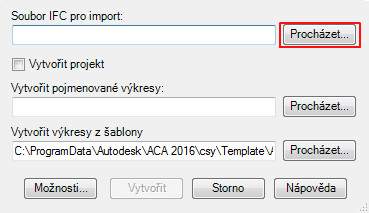 - V dialogu Importovat soubor IFC a vytvořit výkres klikněte na tlačítko Procházet v části Soubor IFC pro import.