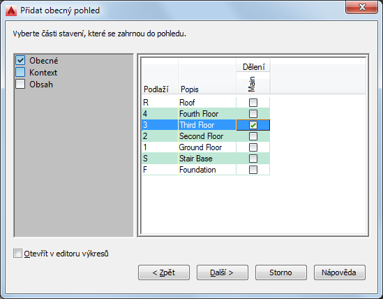 Tento postup slouží k výběru částí budovy, které se mají zahrnout do pohledu při přiřazování hladin a dělení. Pro výkres pohledu můžete vybrat více hladin a dělení, například k vytvoření pohledu na celou budovu. Tím se poskytuje kontext pro výkres pohledu.
