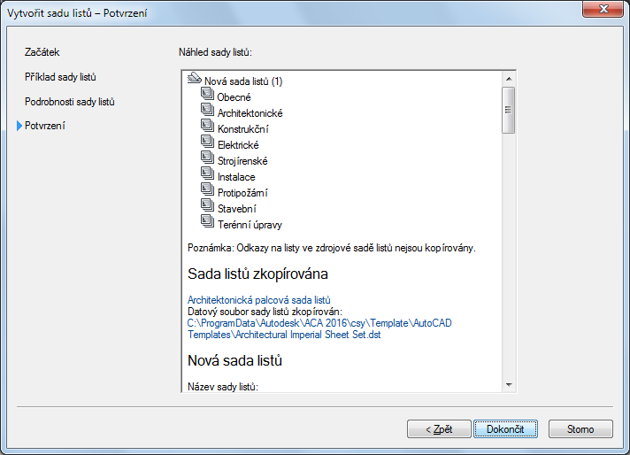 | dokončit vytváření šablony sady listů | klikněte na tlačítko Dokončit. |