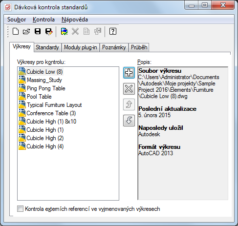 Po nastavení norem aplikace AutoCAD pro projekt je ve složce projektu vytvořen soubor dávkové kontroly CHX s názvem projektu. Soubor CHX obsahuje seznam všech projektových výkresů, které budou zkontrolovány a seznam všech zadaných souborů norem aplikace AutoCAD (DWS), s kterými budou porovnány. Pokud chcete synchronizovat celý projekt proti normám aplikace AutoCAD, musíte spustit tento dávkový soubor pomocí Dávkové kontroly norem aplikace AutoCAD.