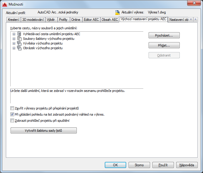 Tento postup slouží k nastavení výchozích možností projektů aplikace AutoCAD Architecture. Pro projekty lze nastavit následující možnosti: