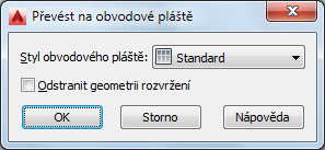 Tento postup použijte, chcete-li vytvořit obvodové pláště, založené na plochách existujících objemových prvků, objemových skupin anebo entit aplikace AutoCAD, jako je síť, přímková plocha anebo těleso. Toto může být užitečné poté, co jste vytvořili model stavby. Pro každou plochu je vytvořen oddělený obvodový plášť. Během procesu převodu jste požádáni o výběr stylu obvodového pláště určujícího počet a velikost buněk v osnově obvodového pláště, stejně jako vzhled buněk, rámu a příčlí.