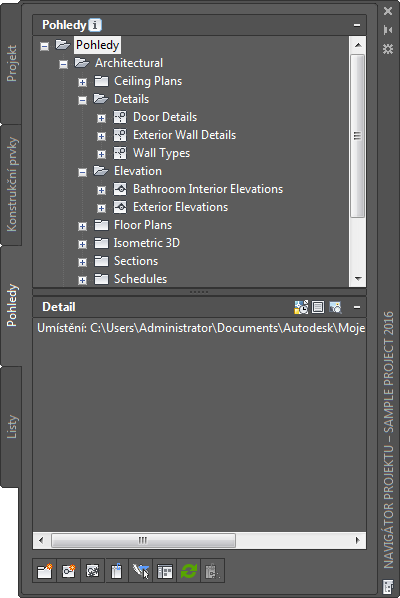 Karta Pohledy na paletě Navigátoru projektu je místem, kde se vytvářejí jednotlivé pohledy vašich stavebních dat. Pohledy obsahují konstrukční prvky a jsou hlavním místem pro přidávání poznámek, štítků a kót v projektu. Po vytvoření výkresu pohledu v něm můžete vytvářet pohledy modelového prostoru.