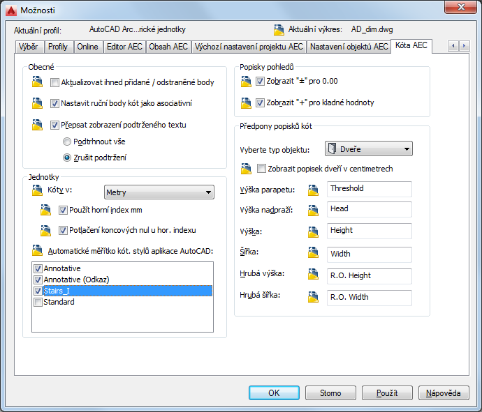 Příklad: Změníte jednotky výkresu z metrů na milimetry. V kótovacím stylu aplikace AutoCAD se změní měřítko následujících nastavení: