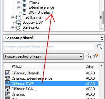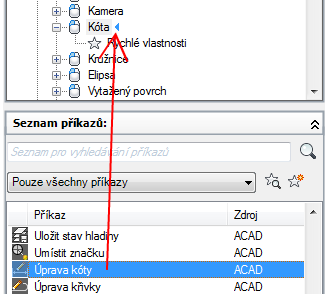 - Pokud chcete nahradit aktuální příkaz přiřazený k akci dvojitého kliknutí, přetáhněte příkaz z podokna Seznam příkazů na akci dvojitého kliknutí v podokně Uživatelské úpravy: <název souboru>.