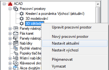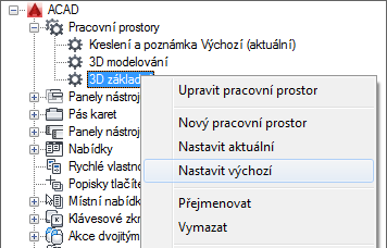 Pracovní prostory v souboru CUIx lze označit jako výchozí. Nastavení pracovního prostoru jako výchozího určuje, který pracovní prostor v souboru CUIx má být obnoven, pokud je soubor CUIx načten do aplikace poprvé nebo pomocí příkazu NAČTICUI.
