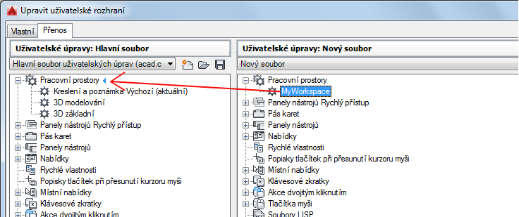 4. V podokně Uživatelské úpravy <název souboru> (vpravo) přetáhněte pracovní prostor ze souboru CUIx do uzlu Pracovní prostor hlavního souboru CUIx v podokně Uživatelské úpravy <název souboru> (vlevo).