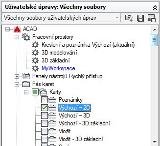 2. Na kartě Vlastní v podokně Uživatelské úpravy: <název souboru> klikněte na znaménko plus (+) vedle uzlu Pracovní prostory. Tento uzel se rozbalí.