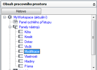 - V podokně Obsah pracovního prostoru klikněte na znaménko plus (+) vedle uzlu Panely nástrojů. Tento uzel se rozbalí.