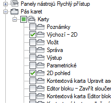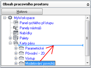 - Vyberte pracovní prostor s kartou pásu, na které chcete změnit vlastnosti panelů pásu karet.