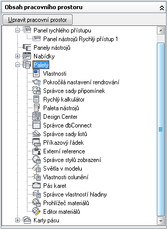 - V podokně Obsah pracovního prostoru klikněte na znaménko plus (+) vedle uzlu Palety. Položka se rozbalí.