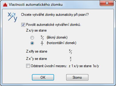 Pokud je zapnuta možnost Automatický zlomek, převede znak lomítka (/) na horizontální zlomek.
