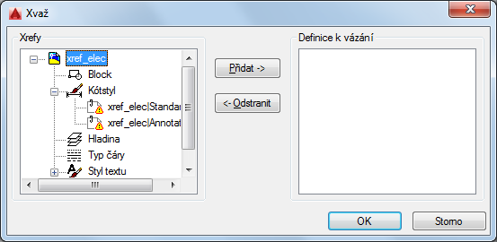 Přesune pojmenované definice objektů zvýrazněné v seznamu externích referencí do seznamu Definice k vázání.