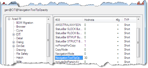 Ve větvi Acad/M > CIT Systémového editoru řídí klíč NavigationToolTipOpacity neprůhlednost místní nápovědy. Tento klíč obsahuje procentuální vyjádření neprůhlednosti; hodnota 100 znamená, že místní nápověda je neprůhledná, zatímco hodnota 0 znamená, že místní nápověda je neviditelná.