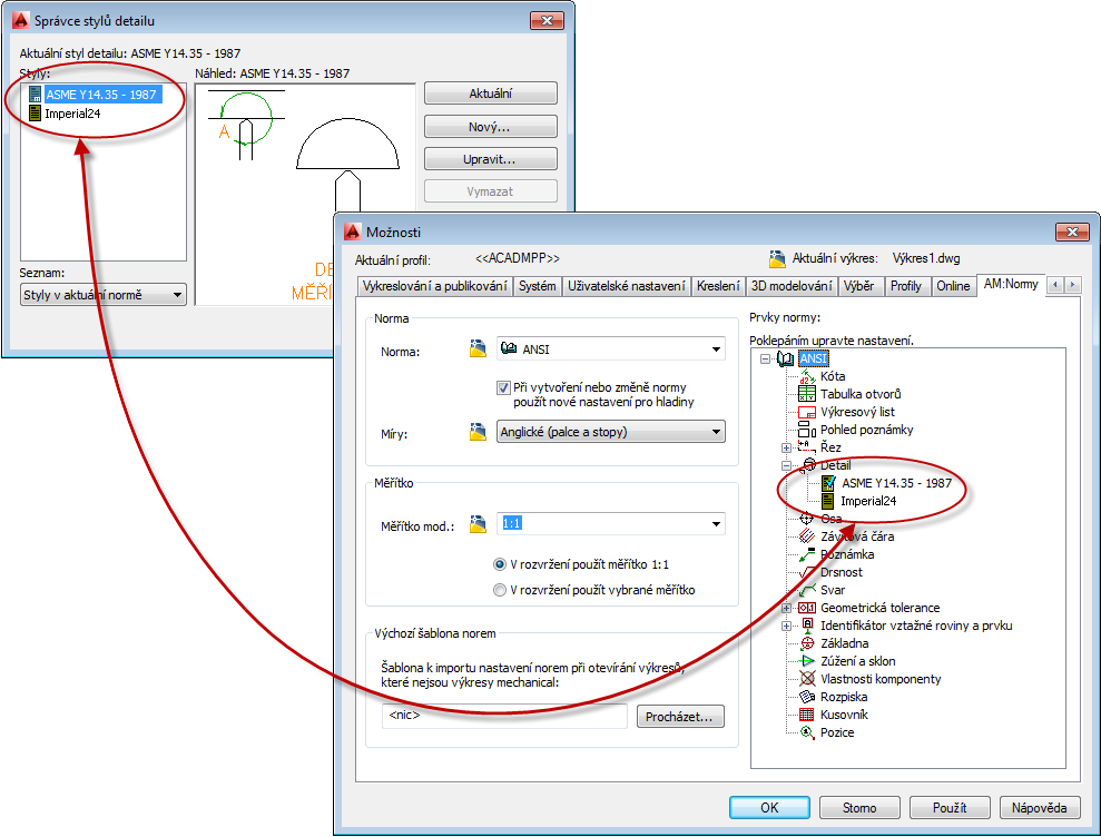 Nastavení, která řídí vzhled objektů aplikace AutoCAD Mechanical, jsou uložena do pojmenované kolekce nastavení, známé jako norma kreslení. Způsob, kterým jsou styly detailů použity s objekty aplikace AutoCAD (detaily dokumentace modelu), se liší od způsobu, kterým jsou použity s objekty aplikace AutoCAD Mechanical (detaily vytvořené pomocí příkazu AMDETAIL). Současně: