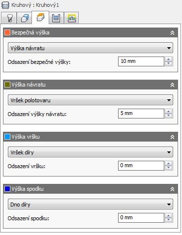 Režim výšky návratu nastaví výšku, do které se nástroj posune před dalším řezným průchodem. Režim výšky návratu musí být nastaven na hodnotu vyšší, než je nastaveno u parametrů Výška posuvu a Horní část. Režim výšky návratu se používá spolu s následným odsazením ke stanovení výšky.