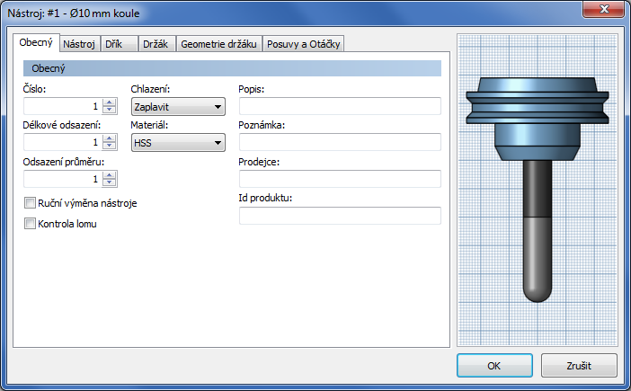 Dialog Nový nástroj frézy umožňuje úpravu jednotlivých nástrojů. Skládá se ze šesti karet: